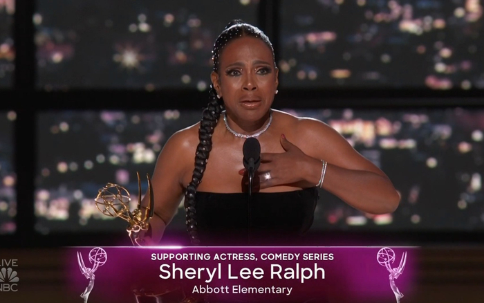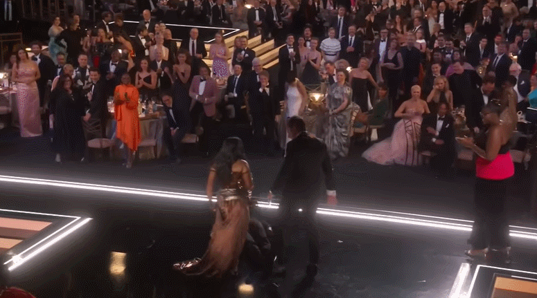 阿奈特从在躺在地上的坎摩尔口袋里掏出颁奖卡,念出了ABC喜剧《小学风云》(Abbott Elementary)编剧昆塔·布伦森的名字,人们随即为布伦森送上欢呼和掌声。《小学风云》是在ABC播出的一个伪纪录片式情景喜剧,故事发生在一所以黑人为主的学校。