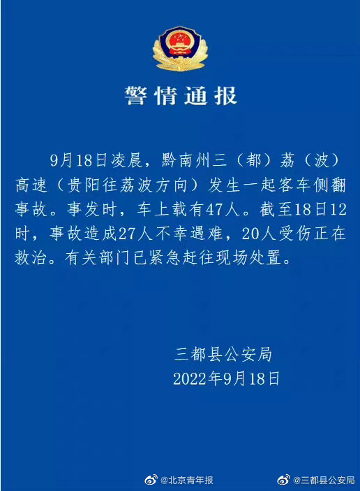 “三都公安”微信公众号9月18日通报,今日凌晨,黔南州三荔高速(贵阳往荔波方向)发生一起客车侧翻事故。事发时,车上载有47人。截至12时,事故造成27人不幸遇难,20人受伤正在救治。有关部门已紧急赶往现场处置。