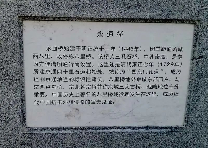 《明英宗实录》记载:“正统十一年八月,建通州八里庄桥,命工部右侍郎王永和督工。”《通州志》记载:“八里庄桥即永通桥,在普济闸东。正统十一年敕建,祭酒李时勉作记。”由于距离通县县城西八里,所以俗称“八里桥”。