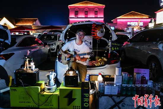 9月11日晚,北京市朝阳区东北五环外,刘征坐在后备厢边弹吉他边唱歌。他是一家户外电源初创公司的合伙人,当天参加后备厢集市主要是为了进行品牌推广,同时也希望了解一些汽车后备厢摊主对户外电源的需求。