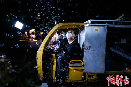 9月18日晚11时,北京市通州区东五环外,临近收摊,王阳坐在自己花2000多元收购的二手快递车上试玩泡泡机。