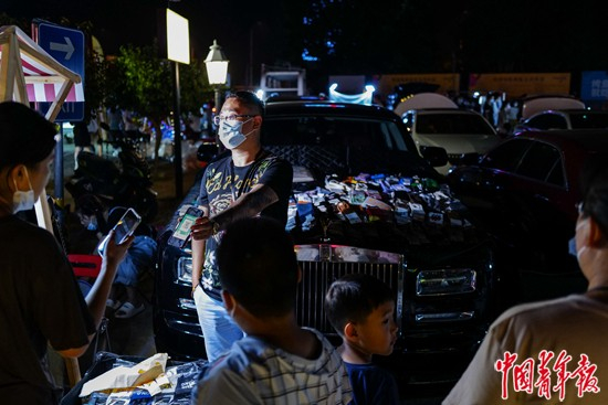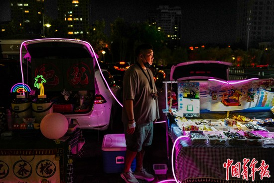 9月8日晚,北京市朝阳区一处商圈,徐云辉在自己的摊位前。每次出摊,他都会根据场地售卖不同的货品,写字楼白领比较多,他就会卖蛋糕和零食,商圈年轻人和小朋友比较多,他会选择卖玩具和影视剧周边。他觉得,后备厢摆摊并没有想象的那么轻松,大量时间要用在找渠道、选品、盘库存等一系列的事情上。
