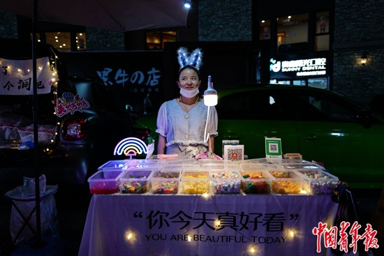 9月8日晚,北京市朝阳区一处商圈,小李在售卖糖果。此前她在一家教培机构做课程顾问销售,今年9月初,受新冠肺炎疫情影响辞职后,她做起了后备厢摆摊的生意,每周五和周末开车出摊,每次营收500元到1000元不等。