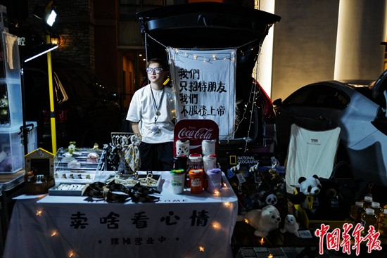 9月8日晚,北京市朝阳区一处商圈,白庆在自己的后备厢摊位前,他的摊位主要售卖小零食和柠檬茶,渴了自己也会喝上几杯。在他看来,除了对外售卖,这些商品其实也是给自己和朋友准备的,由于工作繁忙,平日里他和朋友聚会的机会并不多,现在这个摊位成了朋友聚会的好地方。