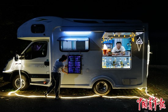 9月18日夜12时,北京市通州区东五环外,吕斌斌和妻子在房车处摆摊。这辆经过改造的房车,在一年多的时间里陪着他走过了许多城市,那些曾经只在商务出差中短暂到访过的地方,如今他可以用一半时间去观光,一半时间卖冰淇淋贴补日常基本开销。
