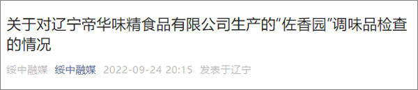 据“绥中融媒”微信公众号消息,9月24日,辽宁省葫芦岛市绥中县市场监督管理局发布关于对辽宁帝华味精食品有限公司生产的“佐香园”调味品检查的情况。