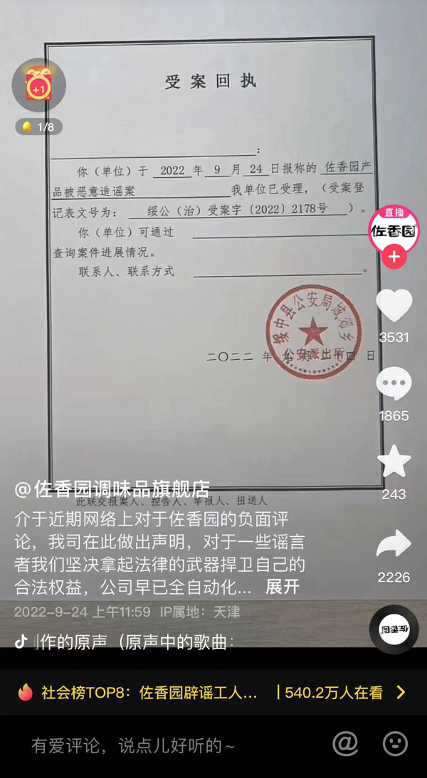 针对此事,辽宁帝华味精食品有限公司24日发布公告,回应网传“工人往黄豆酱里大小便”一事,称网上不实言论均系诽谤,当前已向公安机关报案,并于同日中午在其官方抖音平台上发布了警方受案回执。