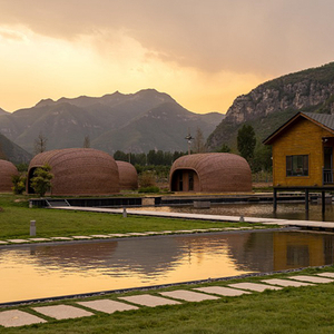 6月8日,山西省长治市黎城县源泉村发展乡村旅游,打造特色民宿,太行山脚下,一个个形似鸟巢的民宿,依山傍水在夕阳的余晖中宛如童话世界。视觉中国供图