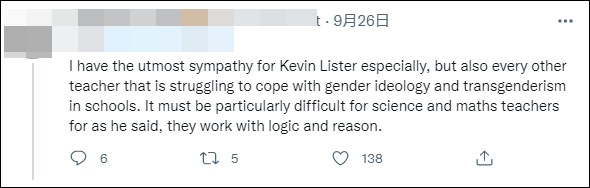 “我特别同情凯文·李斯特,还有每一位努力应对学校性别意识形态和跨性别主义的老师。对于科学和数学老师来说,这一定特别困难,因为正如他所说,他们的工作与逻辑和理性有关。”