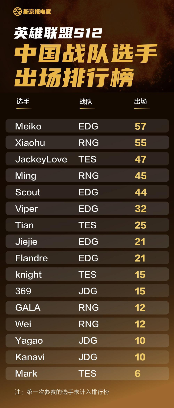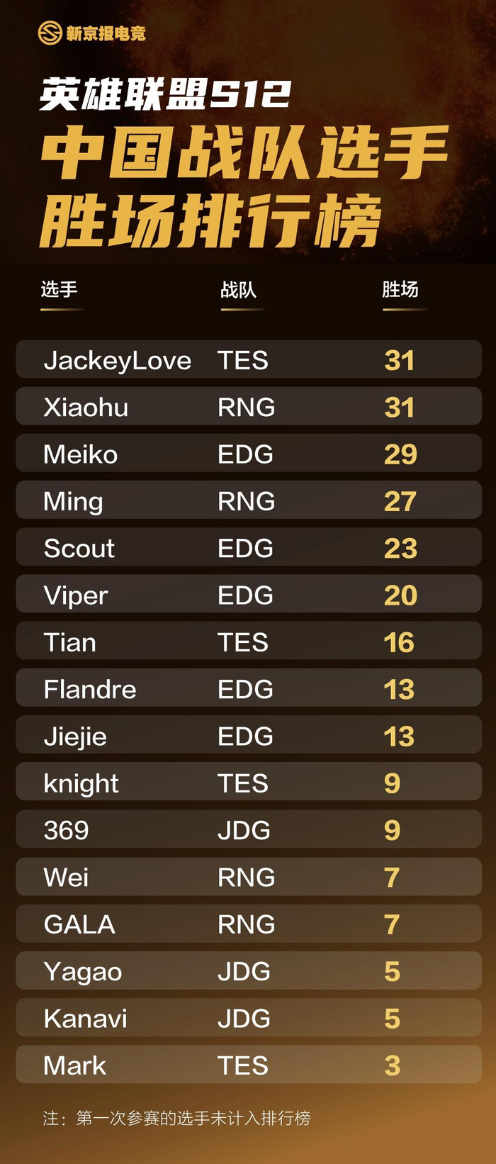 英雄联盟S12中国战队选手出场及胜场排行榜,看看都是谁在领跑