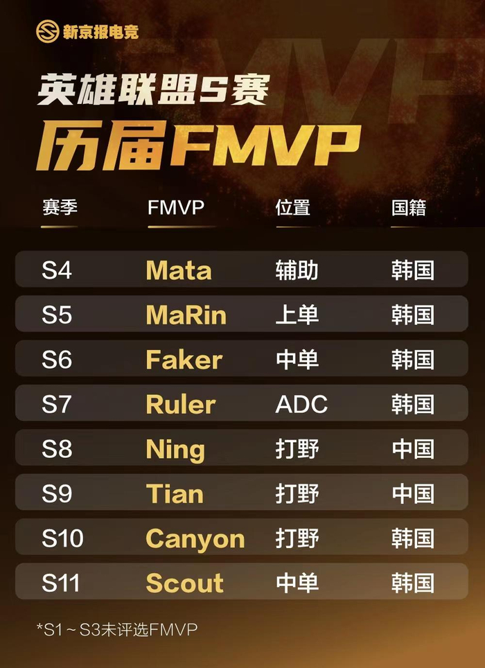 新京报电竞统计发现,截至目前,尚未有选手能实现多次FMVP。8位拿到过FMVP的选手中,6位来自韩国,两位来自中国。2018年,中国战队iG夺冠,中国选手高振宁(ID:Ning)当选FMVP。2019年,中国战队FPX夺冠,中国选手高天亮(ID:Tian)当选FMVP。