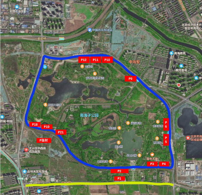 南海子公园共开放14个停车场,分别为:1号、2号、3号、4号、5号、6号、9号、10号、11号、12号、18号、19号、21号、南门临时,具体分布情况如下图: