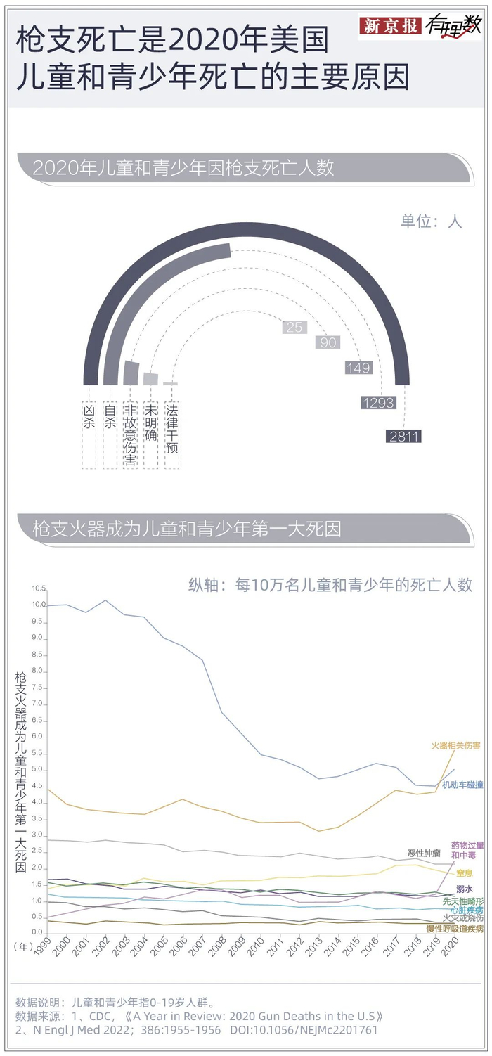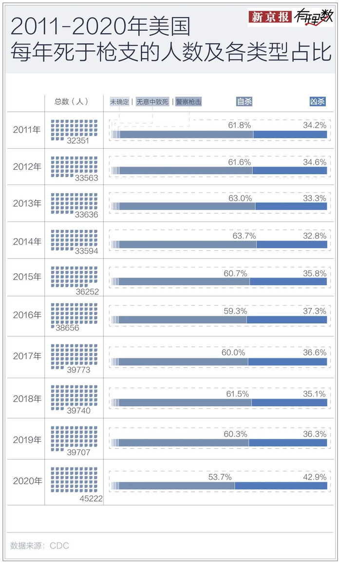 根据最近发表在《新英格兰医学杂志》上的一份研究表明,2020年全年因枪支死亡的4.5万人中,成年人里65%是自杀的结果,30%是凶杀。但在青少年和儿童,这个比例恰好反了过来。