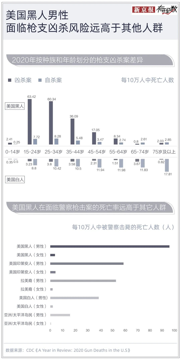 CDC发布的年度报告数据也证实,在枪支凶杀案中,美国黑人面临的风险要远高于白人。2020年,每1000名年轻黑人男性(15-34岁)中就有一人被枪杀,尽管这个群体占了美国总人口的2%,但他们占所有枪杀案死亡者的38%,他们在枪支凶杀案中死亡率比同年龄段的白人男性几乎高21倍。
