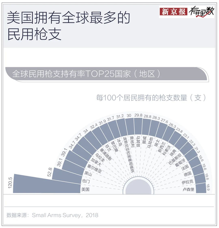 在人均拥有方面,美国每100名居民拥有120.5支枪支,相当于人均1.2支枪,远远超过世界其他国家。