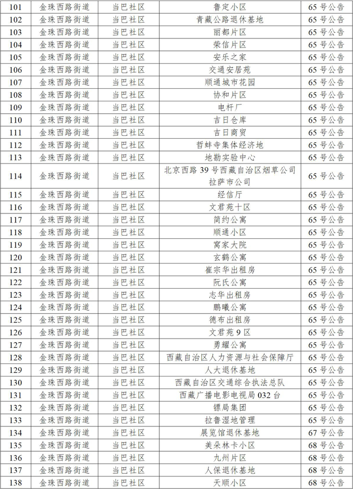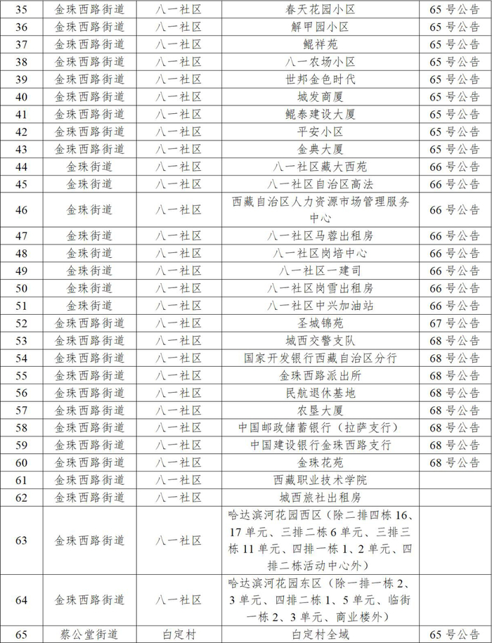 2。金珠西路街道八一社区西藏职业技术学院、城西旅社出租房、哈达滨河花园西区(除二排四栋16、17单元、三排二栋6单元、三排三栋11单元、四排一栋1、2单元、四排二栋活动中心外)、哈达滨河花园东区(除一排一栋2、3单元、四排二栋1、5单元、临街一栋2、3单元、商业楼外);