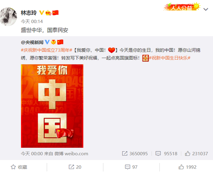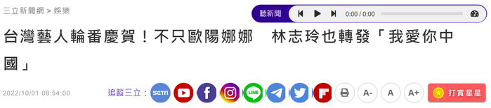 接下来,“三立新闻网”发现不止欧阳娜娜,而是“台湾艺人轮番庆贺”。报道称,台湾艺人汪东城转发@央视新闻 的微博祝福祖国繁荣昌盛;“台湾第一名模”林志玲也转发央视“我爱你中国”微博,还写下“盛世中华,国泰民安”。报道还声称,前阵子因为“吃海鲜”风波被“骂爆”后的杨丞琳也转发央视微博,“高调”庆新中国成立73周年:愿锦绣中华,繁荣富强!#祝新中国生日快乐#