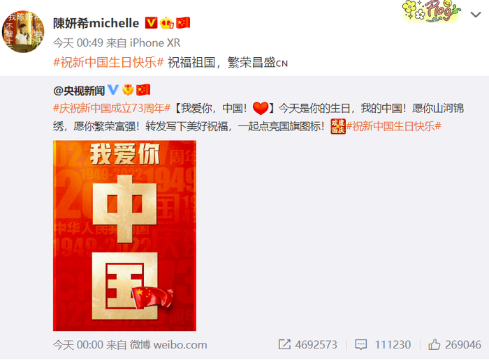 [环球时报报道 记者赵友平]今天是中华人民共和国成立73周年。欧阳娜娜、陈妍希、陈乔恩等多位中国台湾艺人在今日零时后发微博祝福祖国繁荣昌盛。这一切岛内绿媒果然都在盯着。