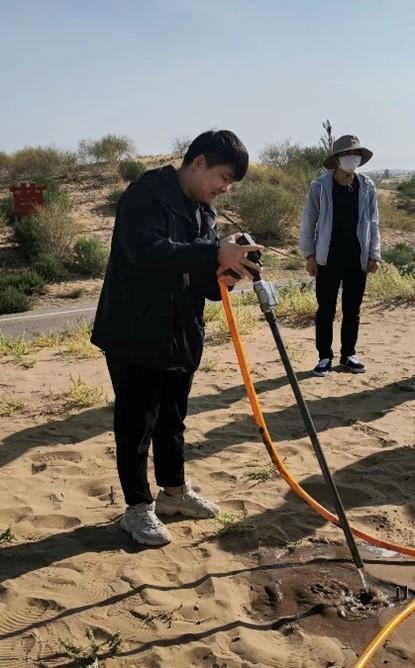 记者采访了解到,这叫“微创植树技术”,在体验沙柳种植的现场,两名种树人一人手持铁质水管,借助水流的冲力,反复在沙地上打孔,达到一定深度后,另一名工人立刻把两根长约1米的沙柳苗埋入沙中,与此同时,水管继续向孔周边冲水,直到沙子将孔洞封严。经过简单的教学后,不少森林探访团里的成员也开始体验,确实简单方便,即便是新学者,两人打配合不到10秒钟就能种好一棵沙柳。