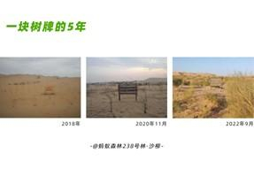 我在当天的分享会上还看到了238号林的五年,2018年时崭新的树牌现在已经斑驳,但当年光秃秃的“木棍儿”也已长成一簇簇沙柳。