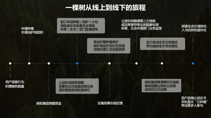 对于个人来说,每天只需要“点点点”便可种下一棵树,但要把树从手机挪到沙漠,大概还需要经过约10个步骤,并不是一件容易的事情。