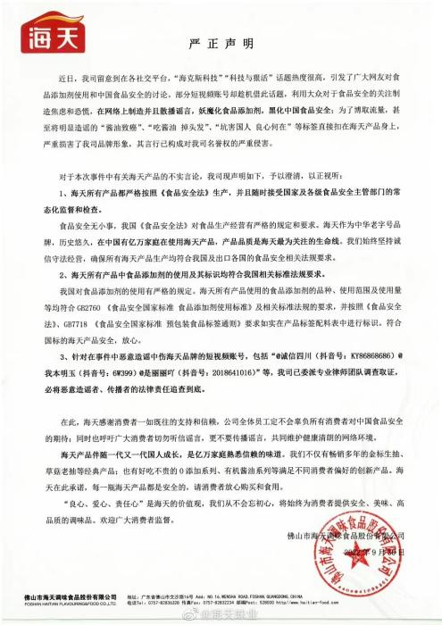 海天味业表示,近日留意到在各社交平台,“海克斯科技”“科技与狠活”话题热度很高,引发了广大网友对食品添加剂使用和中国食品安全的讨论。部分短视频账号却趁机借此话题,利用大众对于食品安全的关注制造焦虑和恐慌,在网络上制造并且散播谣言,妖魔化食品添加剂,黑化中国食品安全;为了博取流量,甚至将明显造谣的“酱油致癌”“吃酱油 掉头发”“坑害国人 良心何在”等标签直接扣在海天产品身上,严重损害了海天品牌形象,其言行已构成对海天味业名誉权的严重侵害。