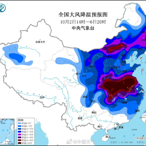 据@中央气象台 受强冷空气影响,预计,10月2日14时至10月6日20时,中东部大部地区气温普遍下降8~12℃,内蒙古中东部、东北地区、陕西大部、山西南部、黄淮、江淮、湖南北部、江西北部、安徽南部、江苏南部、浙江北部等地降温12~16℃,其中,内蒙古中部、黑龙江东部、吉林东部、河南南部、湖北、安徽中北部等地部分地区降温幅度可达18℃以上。6日至7日早晨,最低气温0℃线将位于华北北部、东北地区中部一带,最低气温10℃线将位于四川东北部、湖北北部、河南南部、山东南部一带。长江流域及其以北地区将有4~6级风,高海拔地区及江河湖面阵风可达7~8级。我国北部和东部海域将先后有7~8级大风,阵风9~10级。