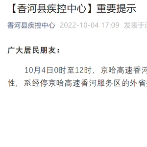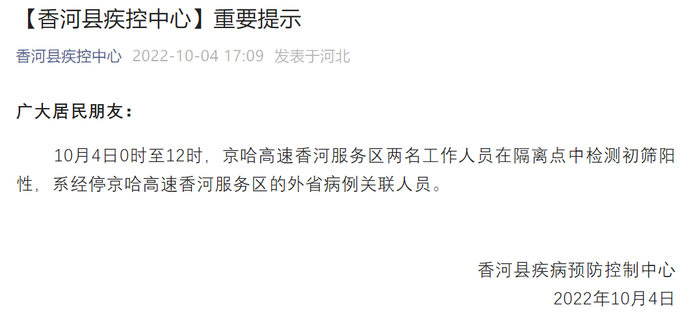 10月4日0时至12时,京哈高速香河服务区两名工作人员在隔离点中检测初筛阳性,系经停京哈高速香河服务区的外省病例关联人员。