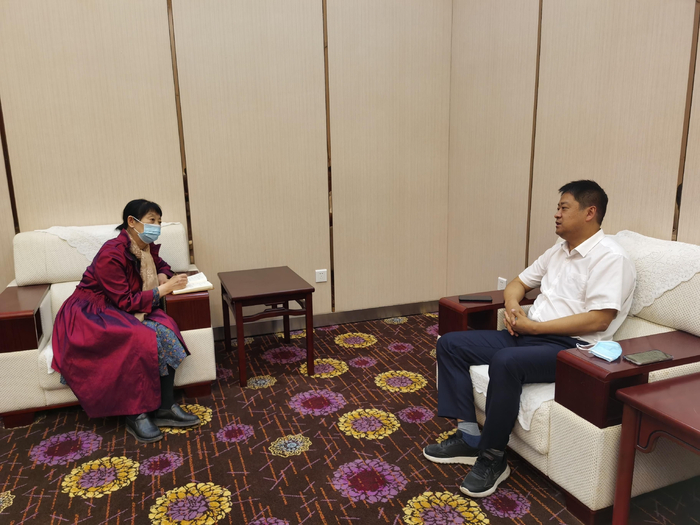 田炜(右)正在接受报告文学《改航》作者的采访。