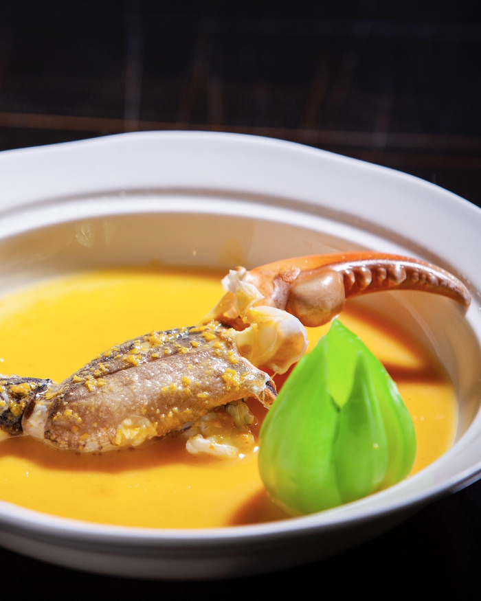 老火炖汤是秋日不可或缺的滋养美食,润燥养肺,一盅入口,身心舒适。不妨试试新明园的招牌靓汤——姬松茸炖辽参汤,食材讲究,将山珍的清香与海味的鲜美相融。螃蟹也是秋季的主角,品蟹膏、食蟹肉,来自季节的赠予怎能错过?花雕蛋白蒸鲜蟹钳是新明园中餐厅的特色菜,蟹钳去壳后加入花雕调味,以清蒸的方式呈现本味,点缀用香叶、香葱调配过的咸蛋黄提味,入口鲜甜细腻。