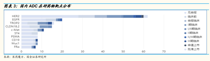 行业对ADC的热情之外,ADC在适应证、靶点等方面的扎堆现象也引发担忧。适应证方面,ADC目前大都针对肿瘤,而在靶点上,国金证券研报指出,ADC产品的靶点分布来看,HER2是最为热门的靶点,EGFR、TROP2、 CLDN18.2、c-Met 也是国内外研发项目较多的靶点。