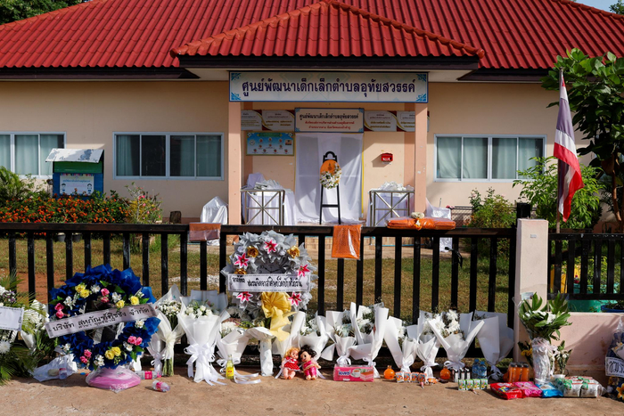 当地时间2022年10月9日,泰国农磨兰普府乌泰沙湾镇,发生枪击事件的保育中心门口摆放着大量鲜花,悼念遇难者。图/IC photo
