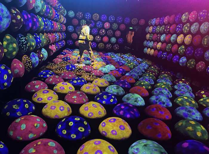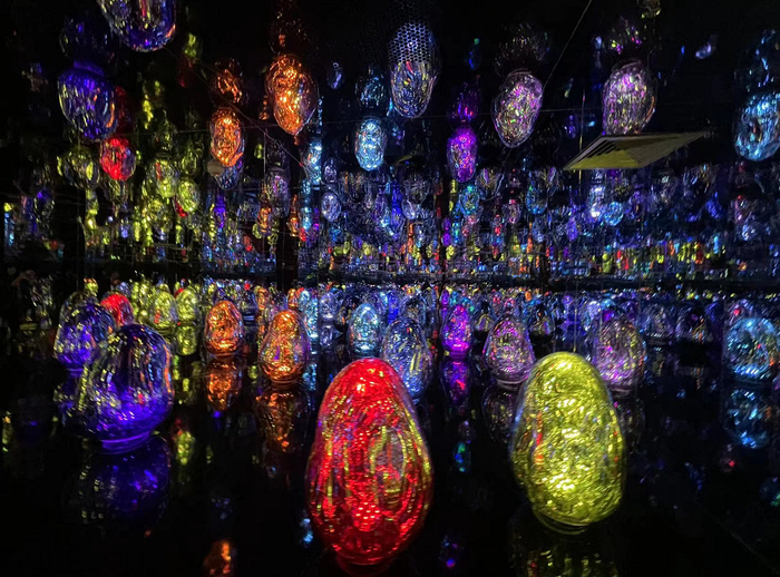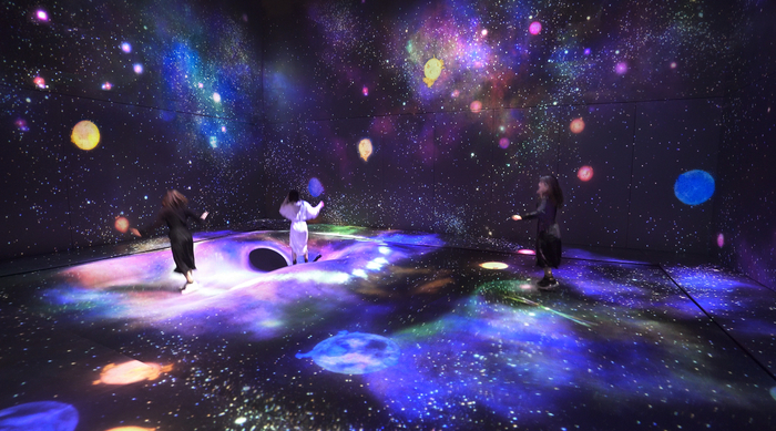 走进艺术空间,仿佛来到了一个梦幻的世界,各个角落都充满了光与影的变幻。现场还有能为观众带来惊喜的互动空间。在“运动森林”中,观众可以通过身体运动,完全沉浸到互动中的世界,“共创!未来园”则是一个能够与他人一同自由创造世界的“游乐园”。观众还可以在“弹弹跳跳床宇宙”空间通过站立或跳跃,感受星尘汇集、星球诞生,也可以在“涂鸦自然”区域共同描绘出各种生物,并使其进入作品的生态系统。