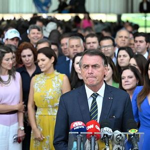 当地时间2022年10月6日,巴西首都巴西利亚,参加连任竞选的巴西总统雅伊尔·博索纳罗在巴西利亚阿尔沃拉达宫会见当选议员后向媒体发表讲话。视觉中国 图