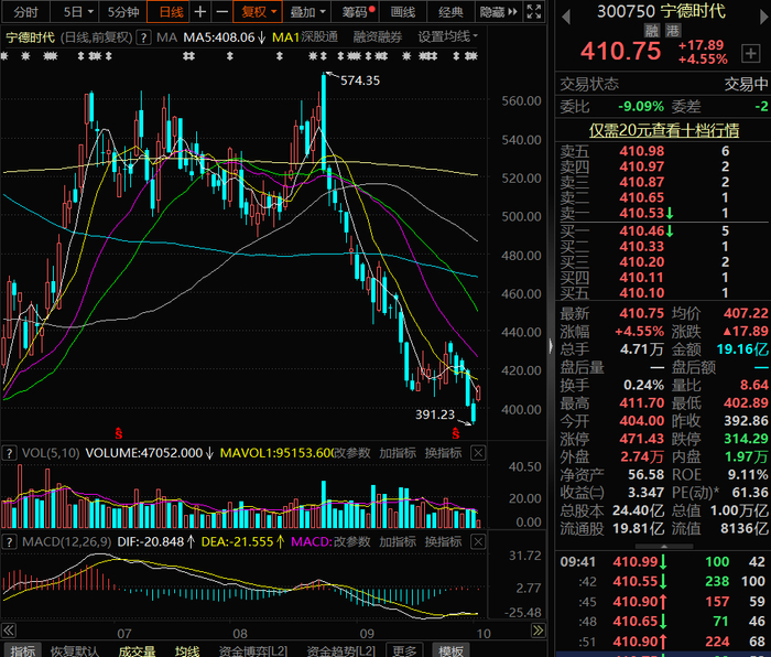 不过宁德时代近期股价表现低迷。该公司10月10日的收盘价为392.86元,单日下跌2%,时隔四个月再度跌破400元大关。