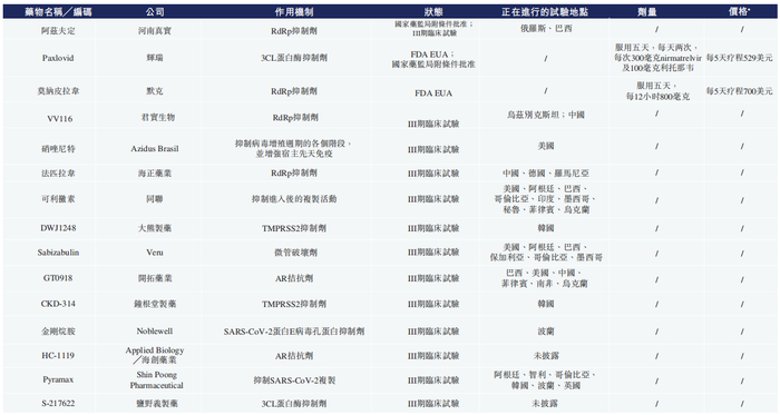 截至2021年年底,全球已上市或正在进行临床三期的新冠口服药物部分名单。