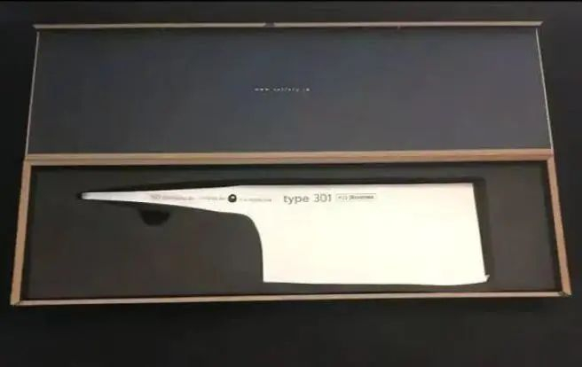 官网显示,这把菜刀整体简约,唯一的装饰便是手柄前端的金属块和字样刻印“Type 301”“纯301钢,由保时捷设计”。