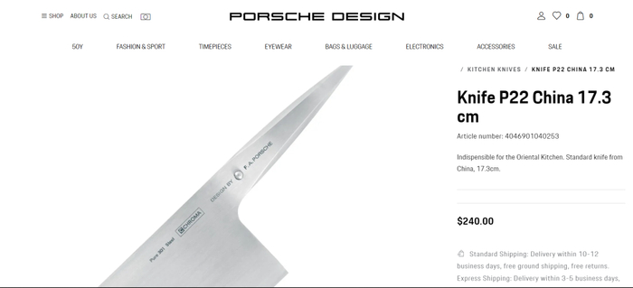 近日,保时捷设计在官网上架一款连刀柄部分都是不锈钢的一体式中国菜刀,名为“P22中国刀 ”,售价240美元(折合人民币约1700元)。保时捷设计在菜刀描述中这样介绍:“东方厨房不可或缺,来自中国的标准刀长度17.3厘米。”