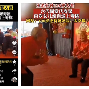 “100岁”女儿给“128岁”母亲祝寿的视频引起一些网民质疑。 图片来源:视频截屏