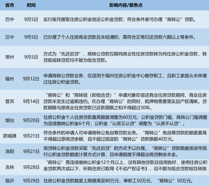 9月以来推出“商转公”政策城市