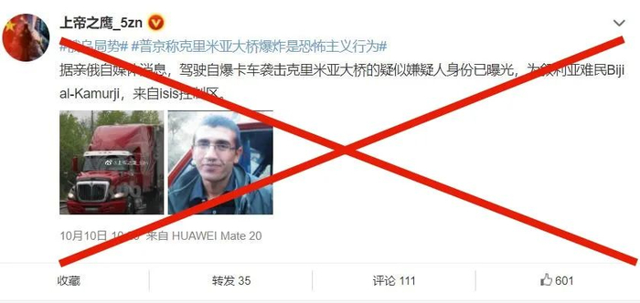 - 网传“克里米亚大桥爆炸卡车的司机是叙利亚难民”的信息不实。相关图片中人物实际为Mümin Aras,是土耳其库尔德工人党(PKK)成员。2016年10月9日,Mümin Aras驾驶卡车在土耳其的宪兵检查站实施自杀式爆炸袭击并丧生。