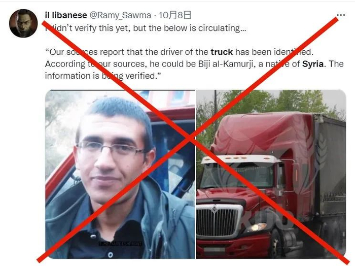 在推特和谷歌对Biji al-Kamurji用英语和阿拉伯语(بيجي الكمرجي)进行检索,发现这个名字只有近期在网传说法中被提到过,并不能找到更早或其他的相关信息。同时,大量网友和部分网站的消息源均指向名为Семён Пегов的推特用户,其在10月8日下午发布了网传的两张图片并用俄语称“我们的消息人士称,卡车司机的身份已被确认。他可能是叙利亚人Biji al-kamurji,信息还在核实中”。10月9日,Семён Пегов再次发文,引用了俄罗斯联邦调查委员会的调查报告并称“看来我们的消息已经确认了”。