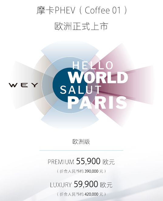 2022年巴黎车展,长城魏牌携摩卡PHEV(Coffee 01)、拿铁PHEV(Coffee 02)重磅登场,并宣布摩卡PHEV(Coffee 01)以55,900~59,900欧元(折合人民币约39~42万)的售价在欧洲市场正式上市。