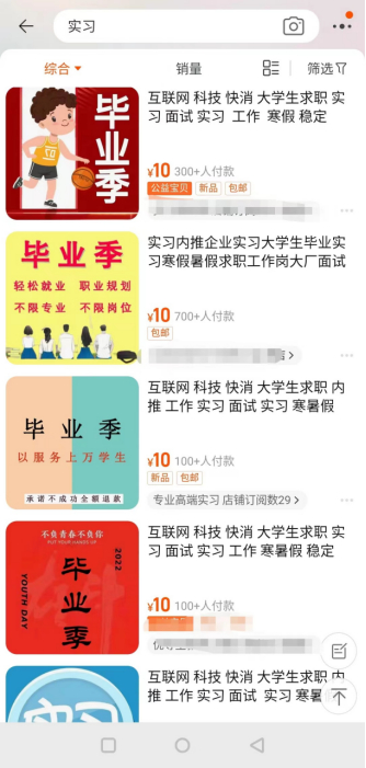 在某社交媒体上,记者搜索“大一大二实习”这一关键词后,显示了两万余条相关笔记,其中不乏有点赞收藏量过万的“热帖”。而在某电商平台内可以搜索到众多名称带有“实习”“实习内推”“保拿offer”等标签的商品,销量最高的店铺月销售量已达数百。