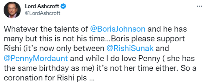 前英国保守党副主席、保守党的主要捐助者迈克尔·阿什克罗夫特则在社交媒体敦促约翰逊支持苏纳克,并表示“无论约翰逊多没有才华,现在已经不是他的时代了。”