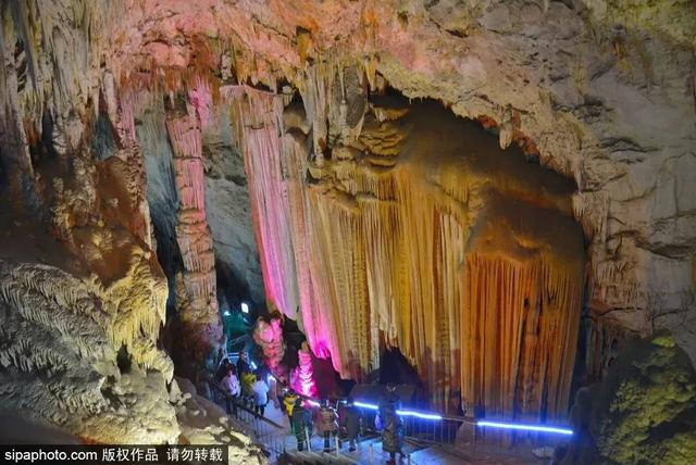 石花洞内的钟乳石景观丰富多样、千姿百态、妙趣横生,或如瀑布飞流,或似万箭齐发,气势磅礴,令人称奇。