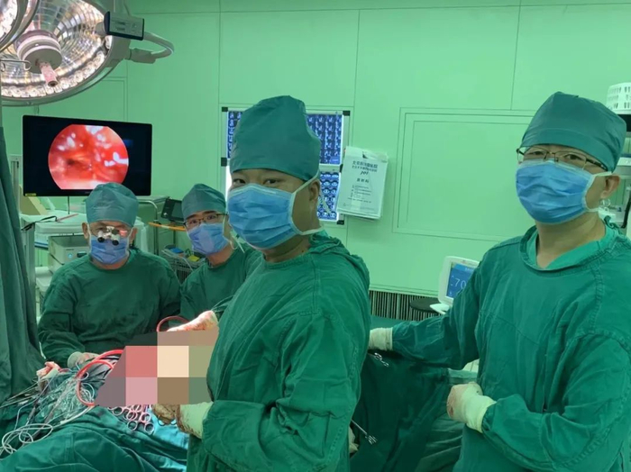 首先,骨肿瘤科刘巍峰主任医师、杨发军副主任医师、手外科王树锋主任医师共同开始显露病变部位。手术采取沿肩胛骨脊柱缘向上走行的斜行切口,分离肩胛骨浅层的肌肉,将肩胛骨向前方掀起,显露肋骨病变,并保护锁骨下血管及臂丛神经。