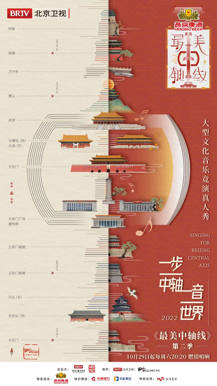 10月29日起每周六20:20, 由北京广播电视台、北京市文物局共同出品,燕京U8独家冠名播出的大型文化音乐竞演真人秀节目《最美中轴线》第二季,即将在北京卫视与大家见面,一起扣响中轴韵律,丈量国都脊梁。