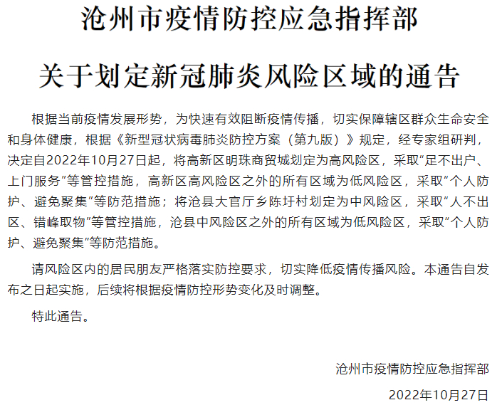 据沧州发布微信公众号消息,2022年10月27日外地推送新冠肺炎阳性人员在该市高新区明珠商贸城经营服装生意,周一到周五每日由外地往返沧州明珠商贸城。自2022年10月27日起,高新区明珠商贸城划定为高风险区,采取“足不出户、上门服务”等管控措施。