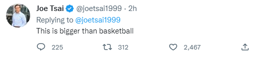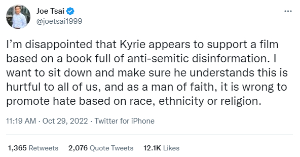 三个多小时后,篮网队老板蔡崇信直接在推特发文,称欧文似乎在支持一部改编自“充斥反犹的虚假信息”的书的影片,并对此表达失望。
